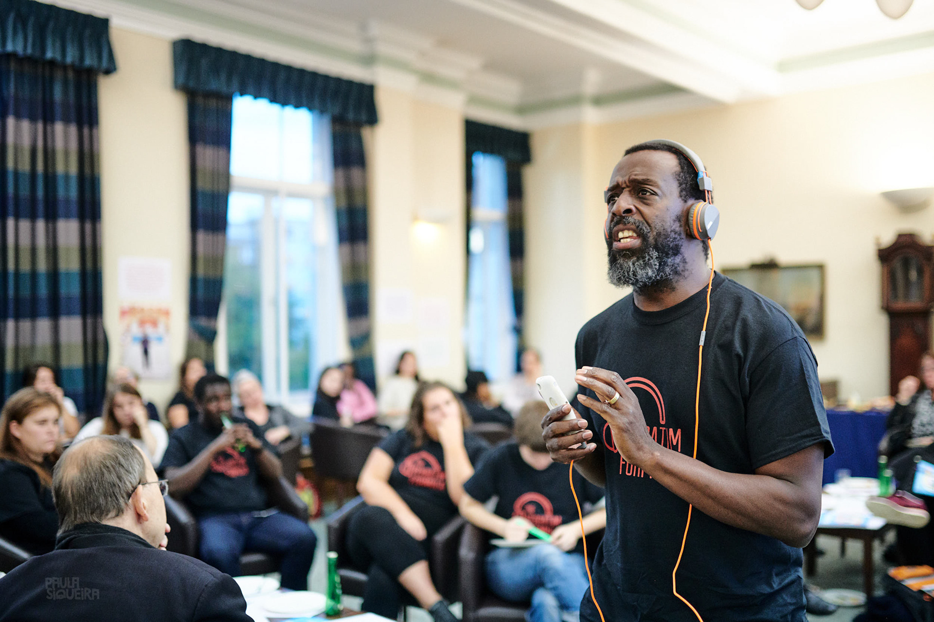 "In The Verbatim Formula we use headphone performance to make audio testimonies that can be shared safely and anonymously. To make the testimonies, participants record interviews with each other, and with facilitators. The content of the recordings is chosen by participants, edited, and loaded up onto MP3 players or iPods. A performer then listens back to the testimonies through personal headphones, and relays the original recording to an audience by paying minute attention to the words on the audio, and repeating them accurately and respectfully. T